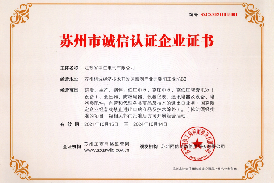 蘇州市誠(chéng)信認(rèn)證企業(yè)證書(shū)